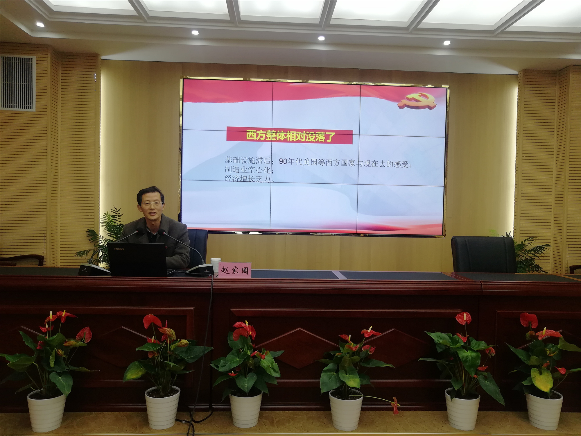 接著,趙家國(guó)教授以“12345”為提綱挈領(lǐng),結(jié)合國(guó)內(nèi)國(guó)外形勢(shì),為大家詳細(xì)解讀了黨的十九屆五中全會(huì)精神的精髓和要義?!?”是一個(gè)重大判斷揭示未來(lái)發(fā)展環(huán)境異常復(fù)雜:《建議》提出當(dāng)前和今后一個(gè)時(shí)期,我國(guó)發(fā)展仍然處于重要戰(zhàn)略機(jī)遇期,但機(jī)遇和挑戰(zhàn)都有新的發(fā)展變化。“2”是兩個(gè)全局了然于胸謀劃未來(lái):《 建議》指出全黨要統(tǒng)籌中華民族偉大復(fù)興戰(zhàn)略全局和世界百年未有之大變局,深刻認(rèn)識(shí)我國(guó)社會(huì)主要矛盾變化帶來(lái)的新特征新要求....。我們從這兩個(gè)大局出發(fā)來(lái)制定規(guī)劃?!?”是三個(gè)“新”揭示新征程無(wú)比豪邁:新階段、新發(fā)展理念、新發(fā)展格局。“4”是四個(gè)首次展現(xiàn)復(fù)興圖強(qiáng)雄心壯志:堅(jiān)持創(chuàng)新在我國(guó)現(xiàn)代化建設(shè)全局中的核心地位,首次把全體人民共同富裕取得更為明顯的實(shí)質(zhì)進(jìn)展作為遠(yuǎn)景目標(biāo)提出,首次明確了建成文化強(qiáng)國(guó)的具體時(shí)間表,明確提出到2035年建成文化大國(guó),首次提出確保二〇二七年實(shí)現(xiàn)建軍百年奮斗目標(biāo)?!?”是五大原則體現(xiàn)黨的領(lǐng)導(dǎo)更加成熟高超:堅(jiān)持黨的全面領(lǐng)導(dǎo),堅(jiān)持以人民為中心,堅(jiān)持新發(fā)展理念,堅(jiān)持深化改革開(kāi)放,堅(jiān)持系統(tǒng)觀念。